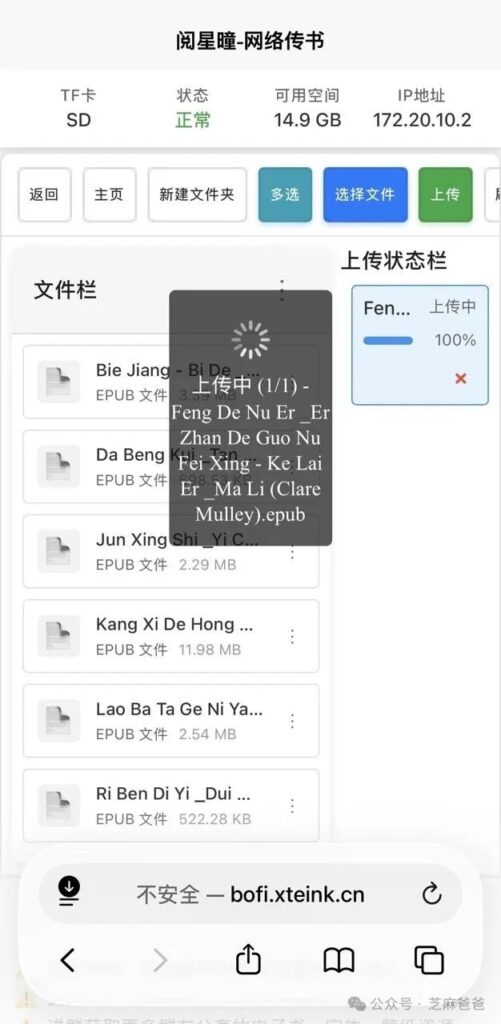 等阅星曈设备连上了热点,通过手机访问 bofi.xteink.cn 即可。这个网页做了自适应,上传速度略慢但还可以接受。